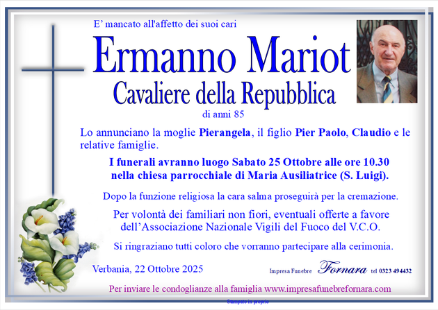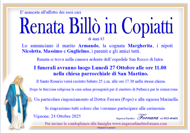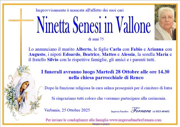L'agenzia funebre di Verbania organizza funerali completi in provincia di Verbano-Cusio-Ossola, provvedendo al disbrigo di ogni pratica di cremazione, comunale e cimiteriale, e a risolvere ogni problematica relativa al decesso. Gli operatori sono persone di grande esperienza, in grado di occuparsi di tutto, sia in abitazione private che in case di cura, cliniche e ospedali. I funerali, civili o religiosi, comprendono ogni fase, dalla vestizione al trasporto della salma con mezzi autorizzati nazionali e internazionali.