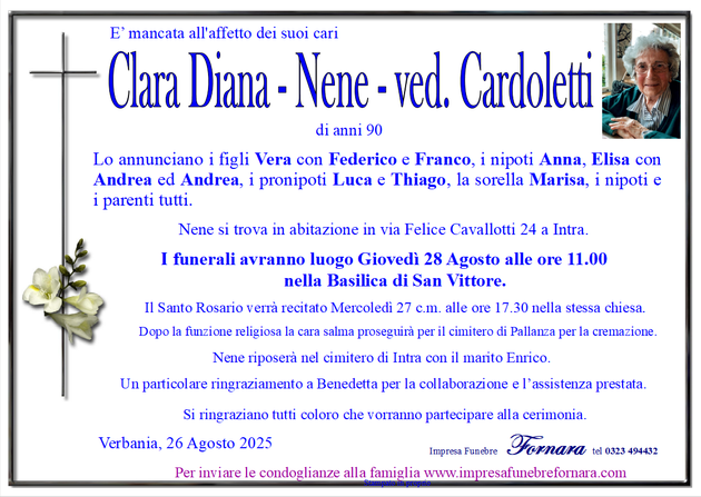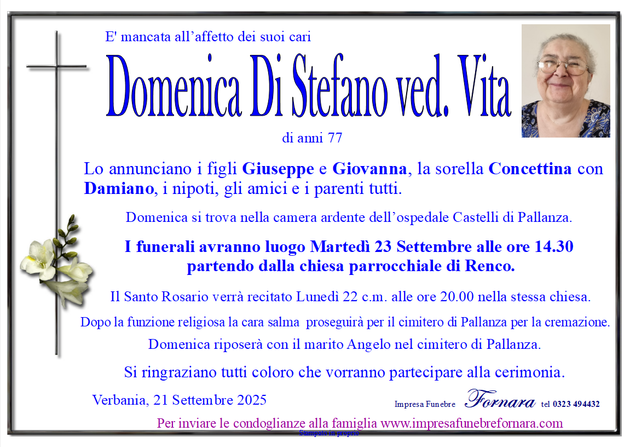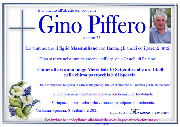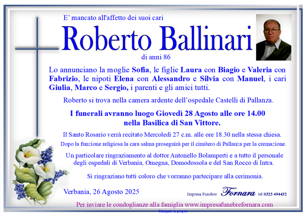 L'agenzia funebre di Verbania organizza funerali completi in provincia di Verbano-Cusio-Ossola, provvedendo al disbrigo di ogni pratica di cremazione, comunale e cimiteriale, e a risolvere ogni problematica relativa al decesso. Gli operatori sono persone di grande esperienza, in grado di occuparsi di tutto, sia in abitazione private che in case di cura, cliniche e ospedali. I funerali, civili o religiosi, comprendono ogni fase, dalla vestizione al trasporto della salma con mezzi autorizzati nazionali e internazionali.